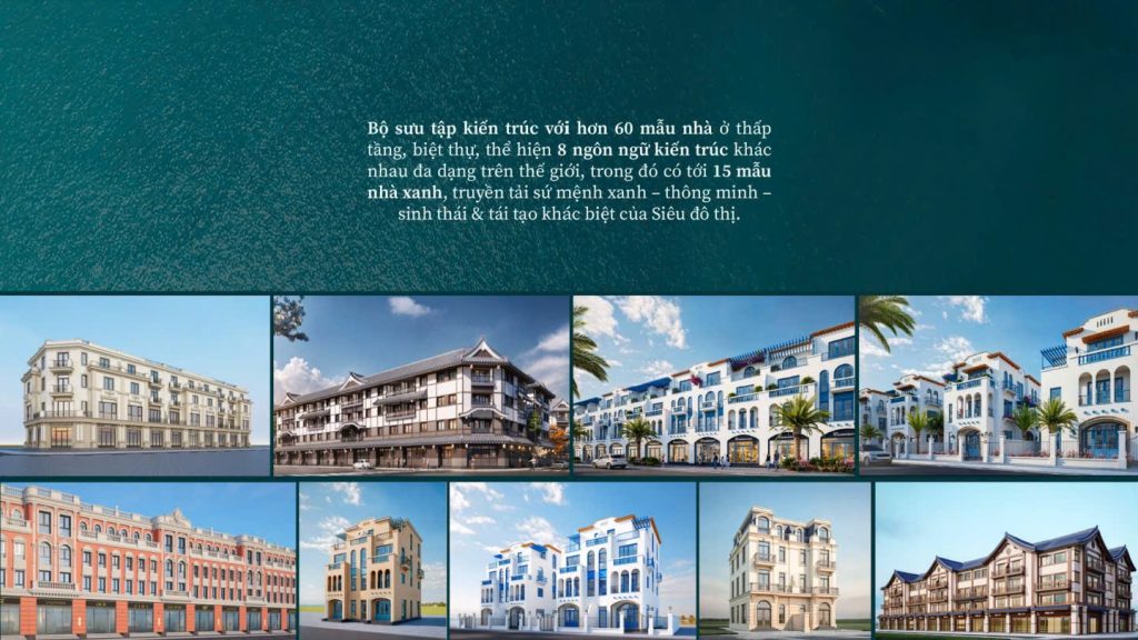 Bộ sưu tập kiến trúc với hơn 60 mẫu nhà ở thấp tầng, biệt thự, thể hiện 8 ngôn ngữ kiến trúc khác nhau đa dạng trên thế giới, trong đó có tới 15 mẫu nhà xanh, truyền tải sứ mệnh xanh – thông minh – sinh thái & tái tạo khác biệt của Siêu đô thị.